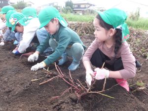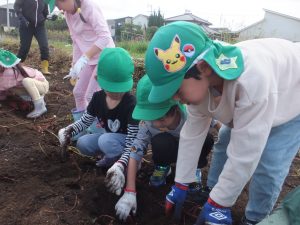 土の中から、お芋が顔を出していたので、今度は一生懸命に土を掘りました。