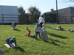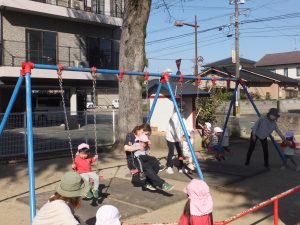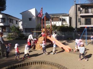 広場で、木の実を拾ったり、遊具で遊んだり、通称「めいろ橋」でかけまわったり、芝生の山を転がったり、元気いっぱい楽しみました。
