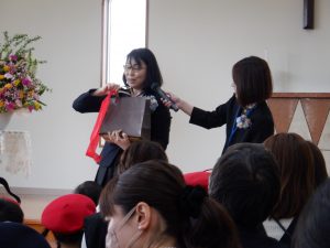 ホールに集まって、大好きなおうちの方と一緒に、入園式をしました。園長先生からお祝いのメッセージをもらい、牧師先生にお祈りをしていただきました。