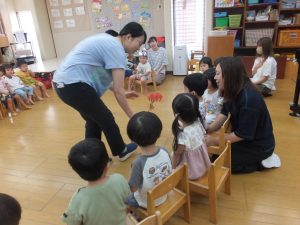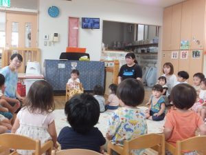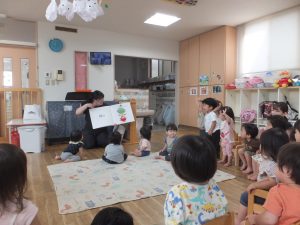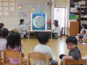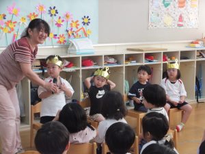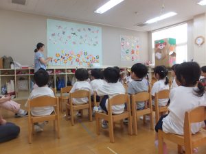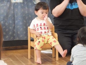 園長先生からのお話では、虫の声を聞いたり、ヒガンバナを見たり、一緒に「こおろぎのうた」「むしのこえ」などを歌ったりとたくさんの秋の紹介もありました。素敵な秋の季節に生まれたお友だちに、「おめでとう」のお祝いのメッセージをいただきました。