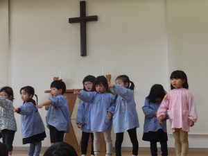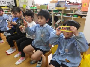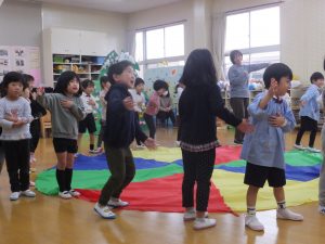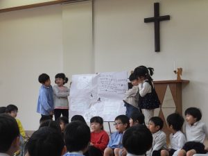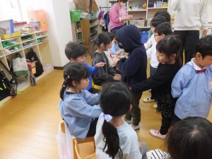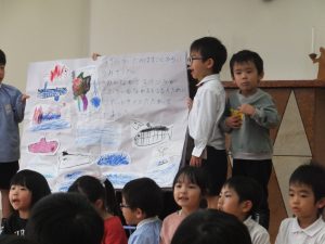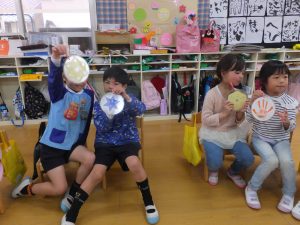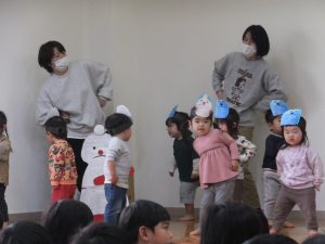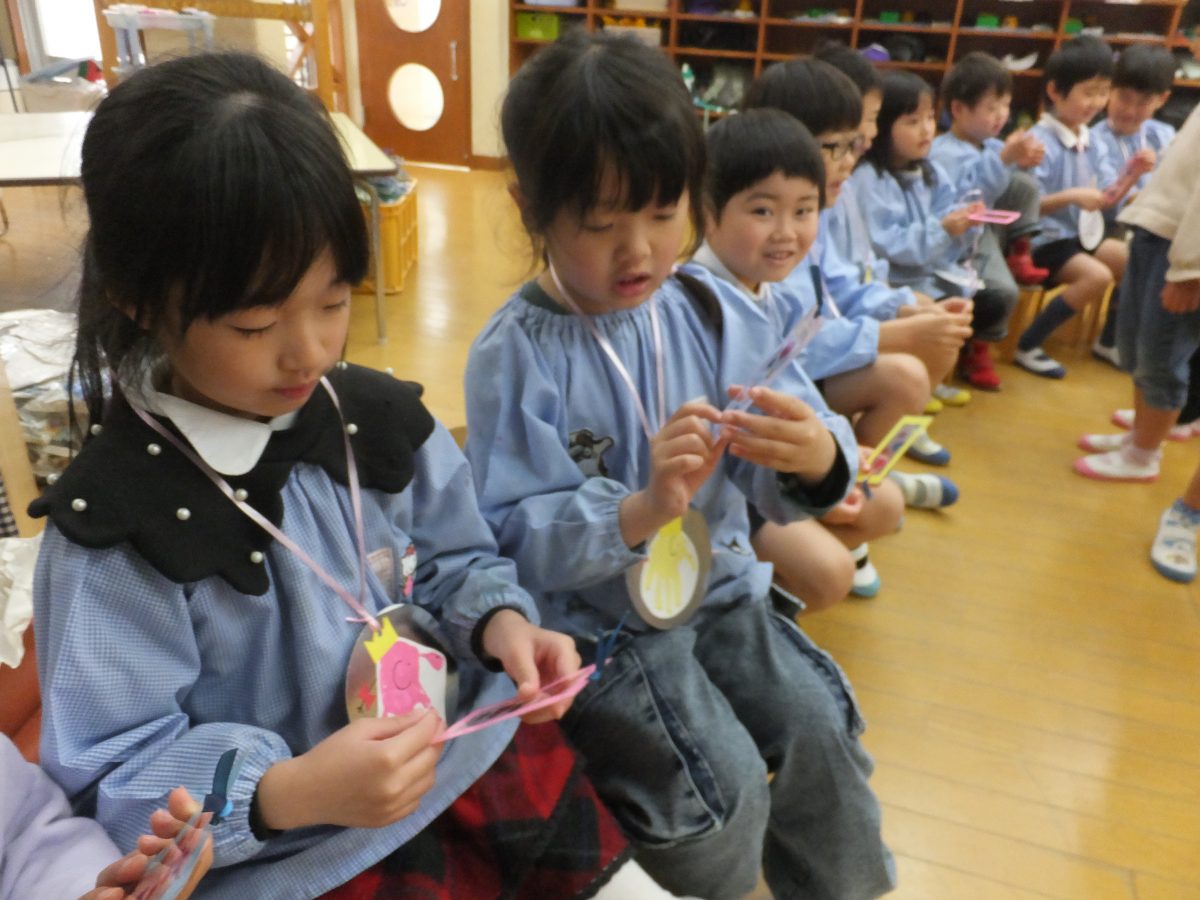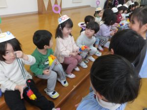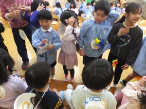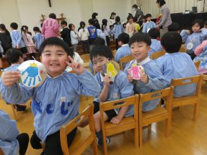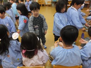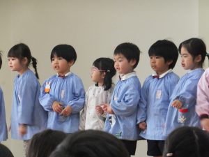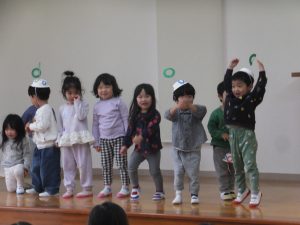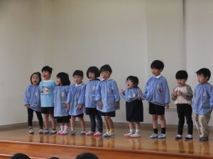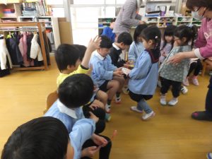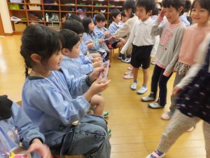 今日は、もうすぐ卒業して、小学1年生になる緑組さんへ、出し物をしたり、プレゼントを渡したりして、「ありがとう」の気持ちを伝える「園内お別れ会」がありました。