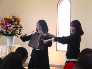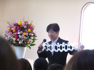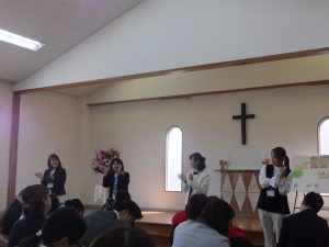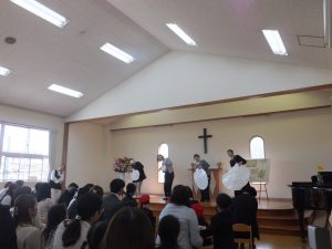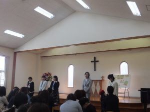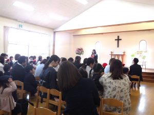 ホールに集まって、大好きなおうちの方と一緒に、入園式をしました。園長先生からお祝いのメッセージをもらい、牧師先生にお祈りをしていただきました。